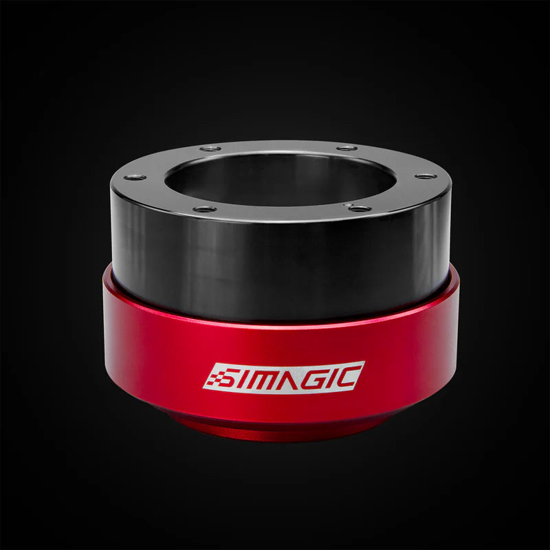 SIMAGIC QR70 Quick Release: CNC machined aluminum, 70 mm PCD, fast and play-free push-release system. Rigid and reliable connection for SIMAGIC and compatible steering wheels.