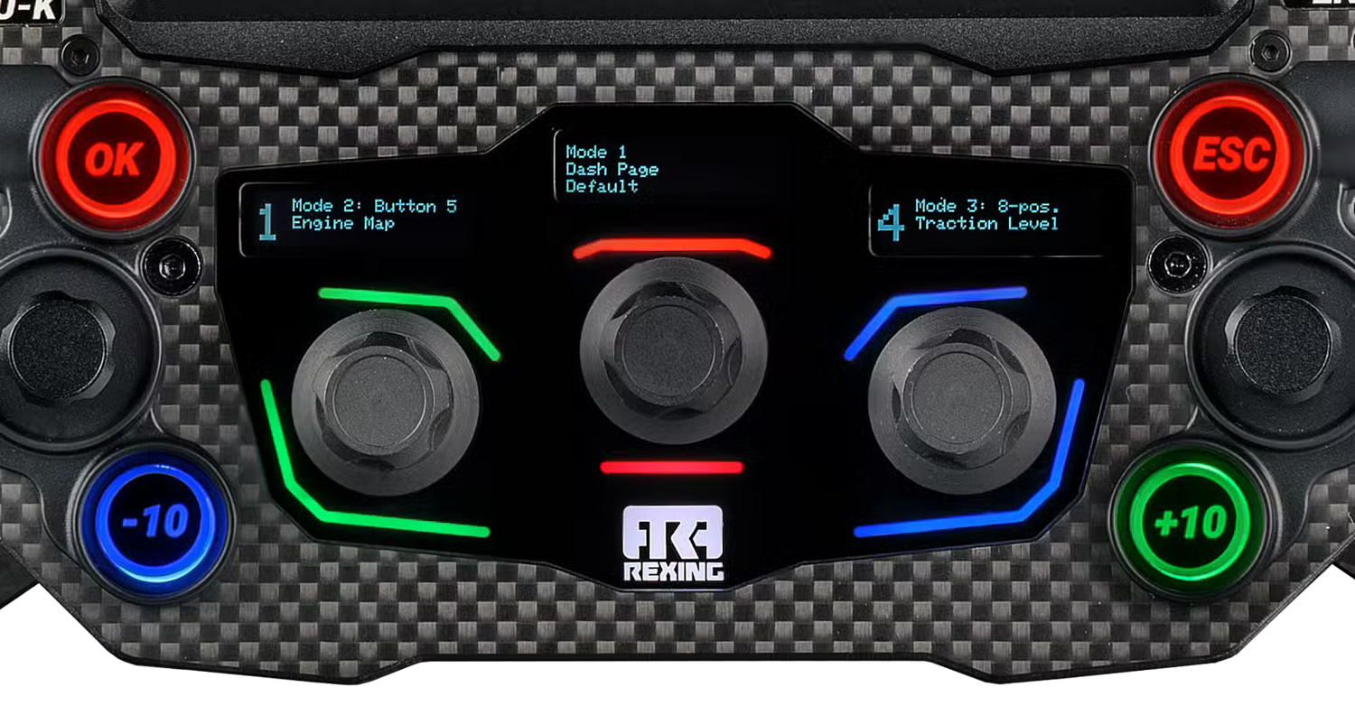 Volant Rexing Mayaris 2 — châssis carbone, écran 5″ tactile, 10 boutons RGB, 3 OLED, paddles magnétiques, personnalisation SimHub.
