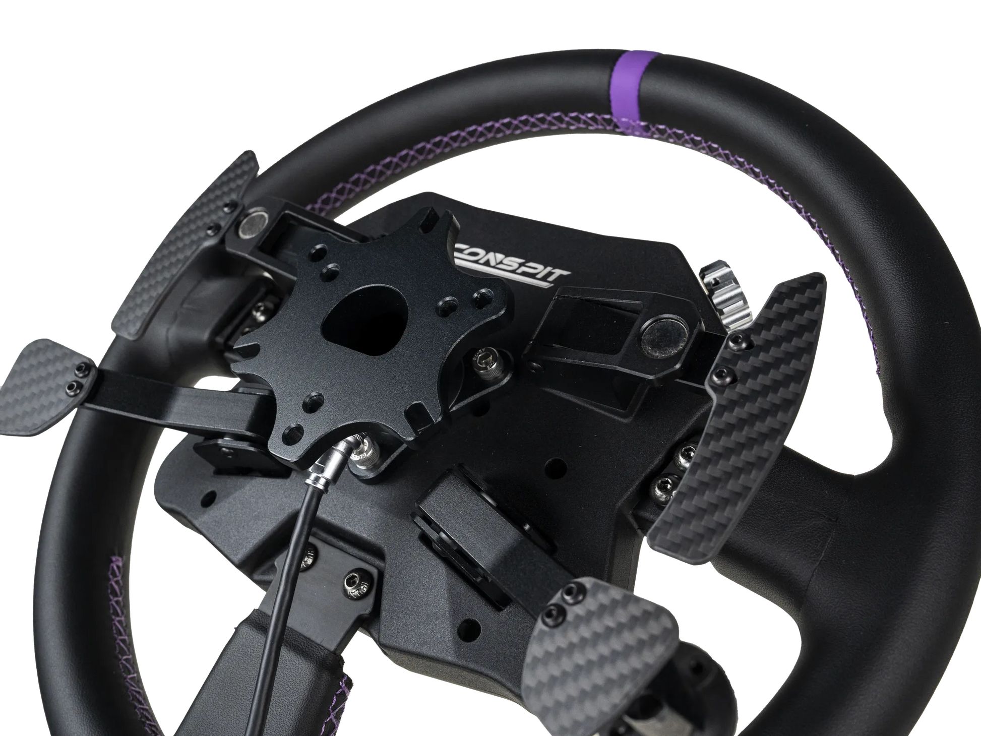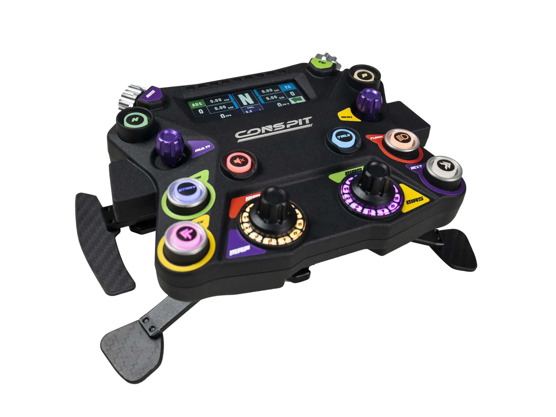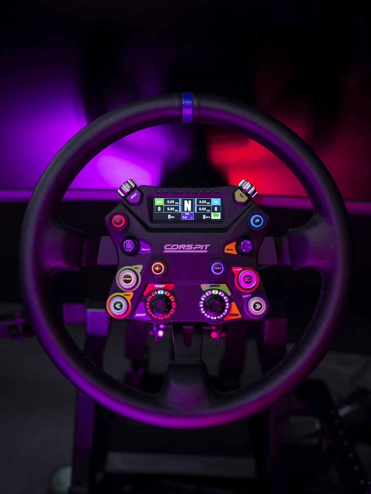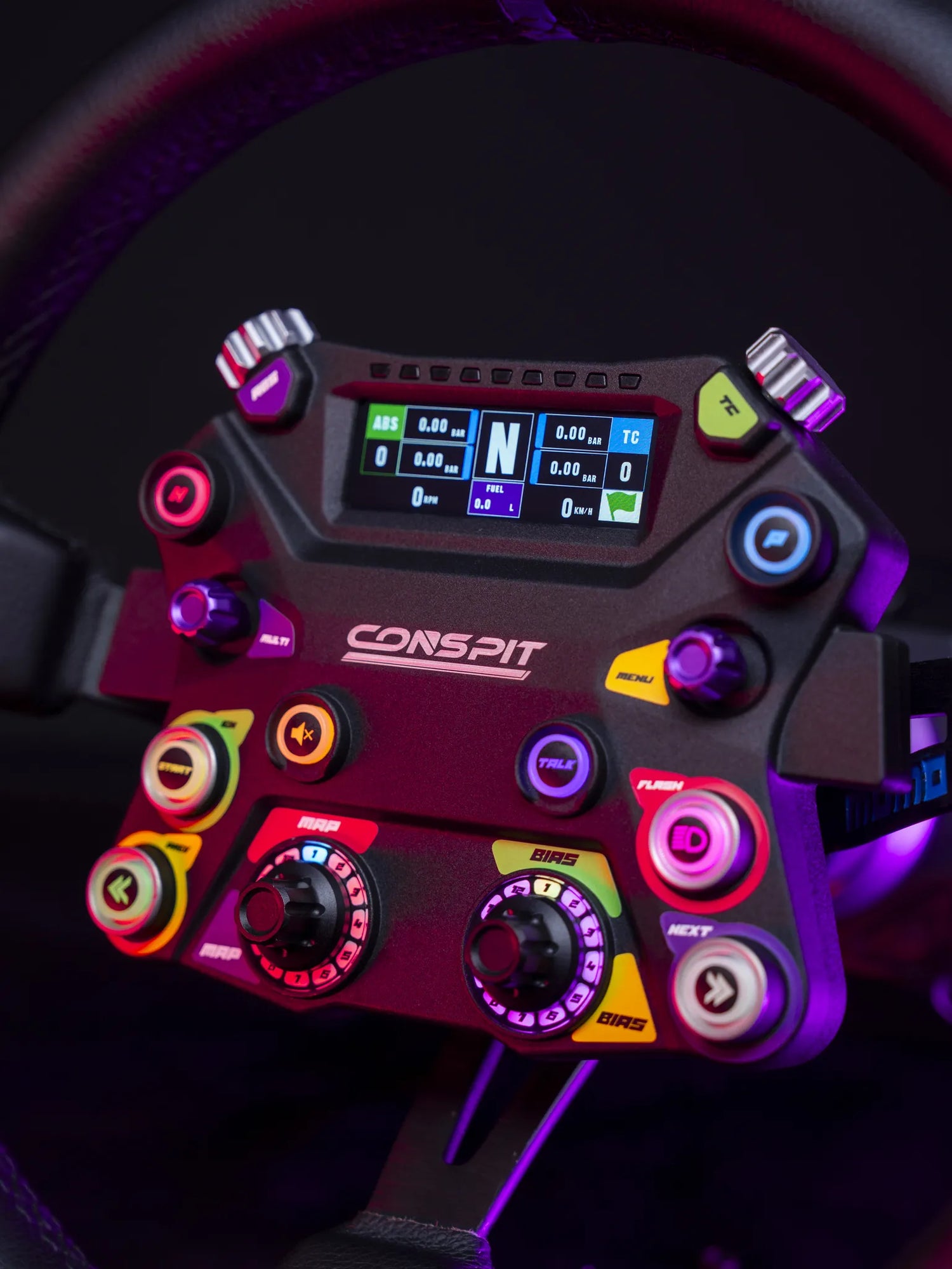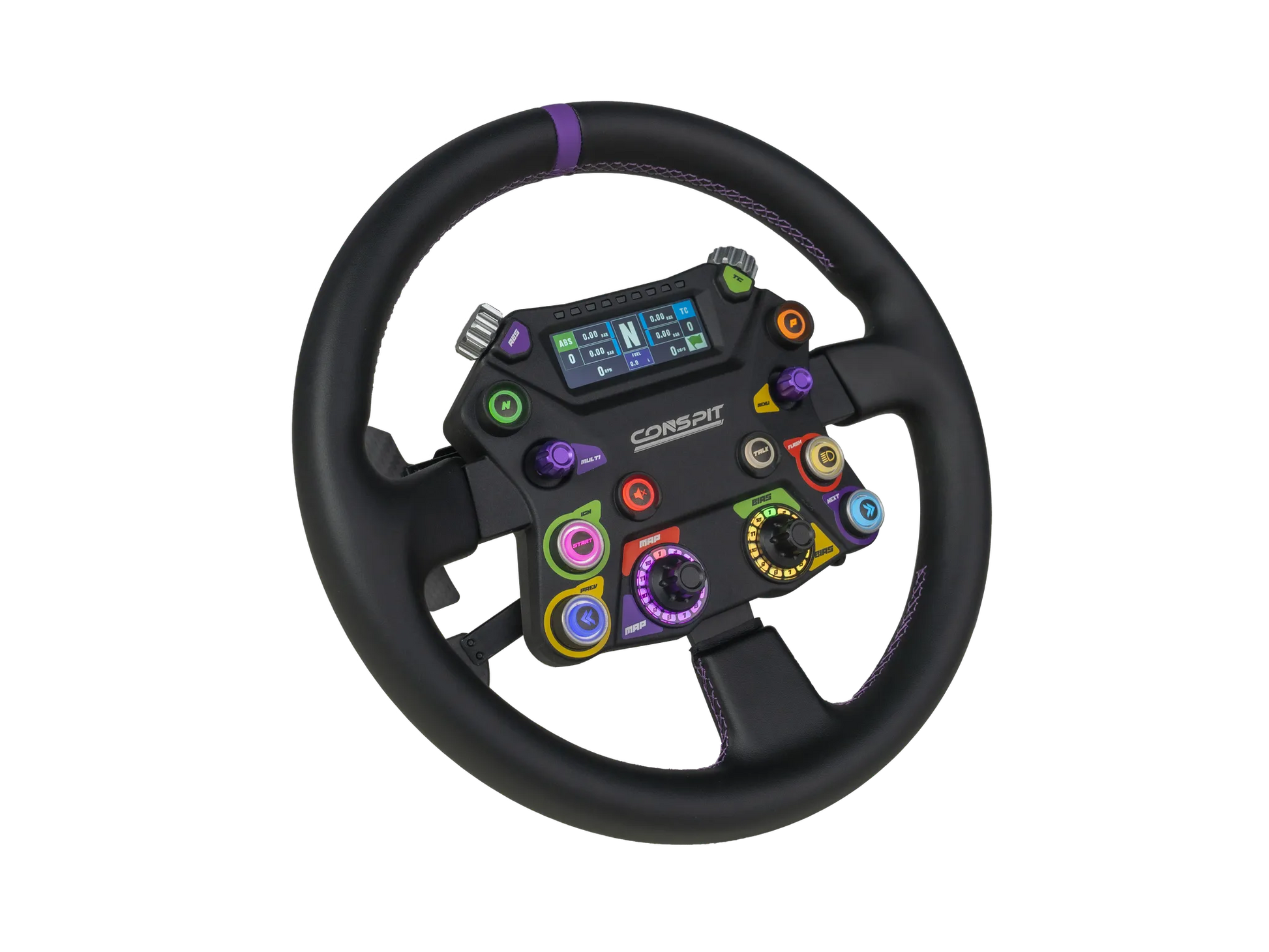 Volant CONSPIT 310 APEX : volant rond 310 mm avec écran 2,99″, LED RGB, palettes magnétiques et embrayage dual clutch. Polyvalence et performance GT.