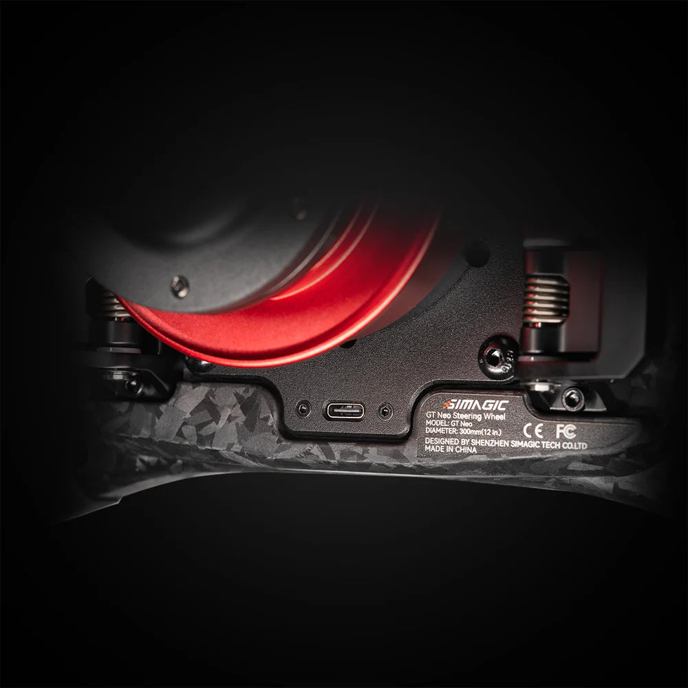 Volant SIMAGIC GT NEO : 300 mm, composite carbone, 10 boutons RGB, encodeurs & palettes magnétique, QR50 & Maglink. Contrôle, légèreté et compatibilité pour simracers exigeants.